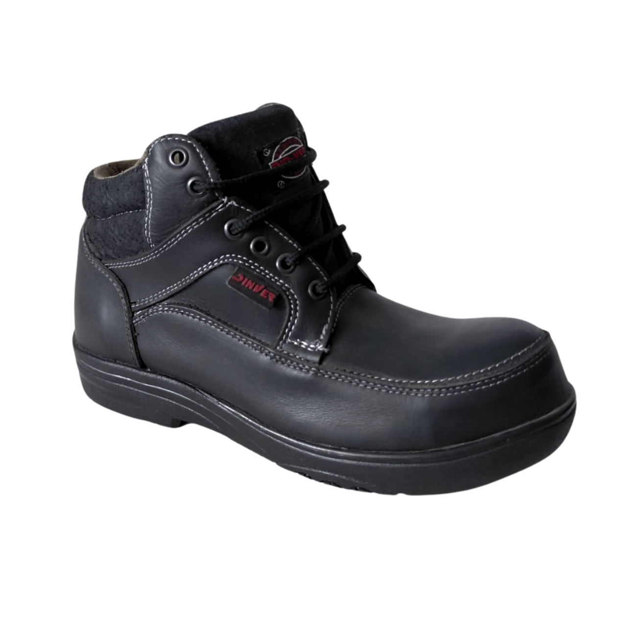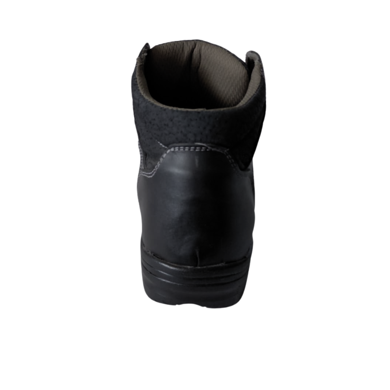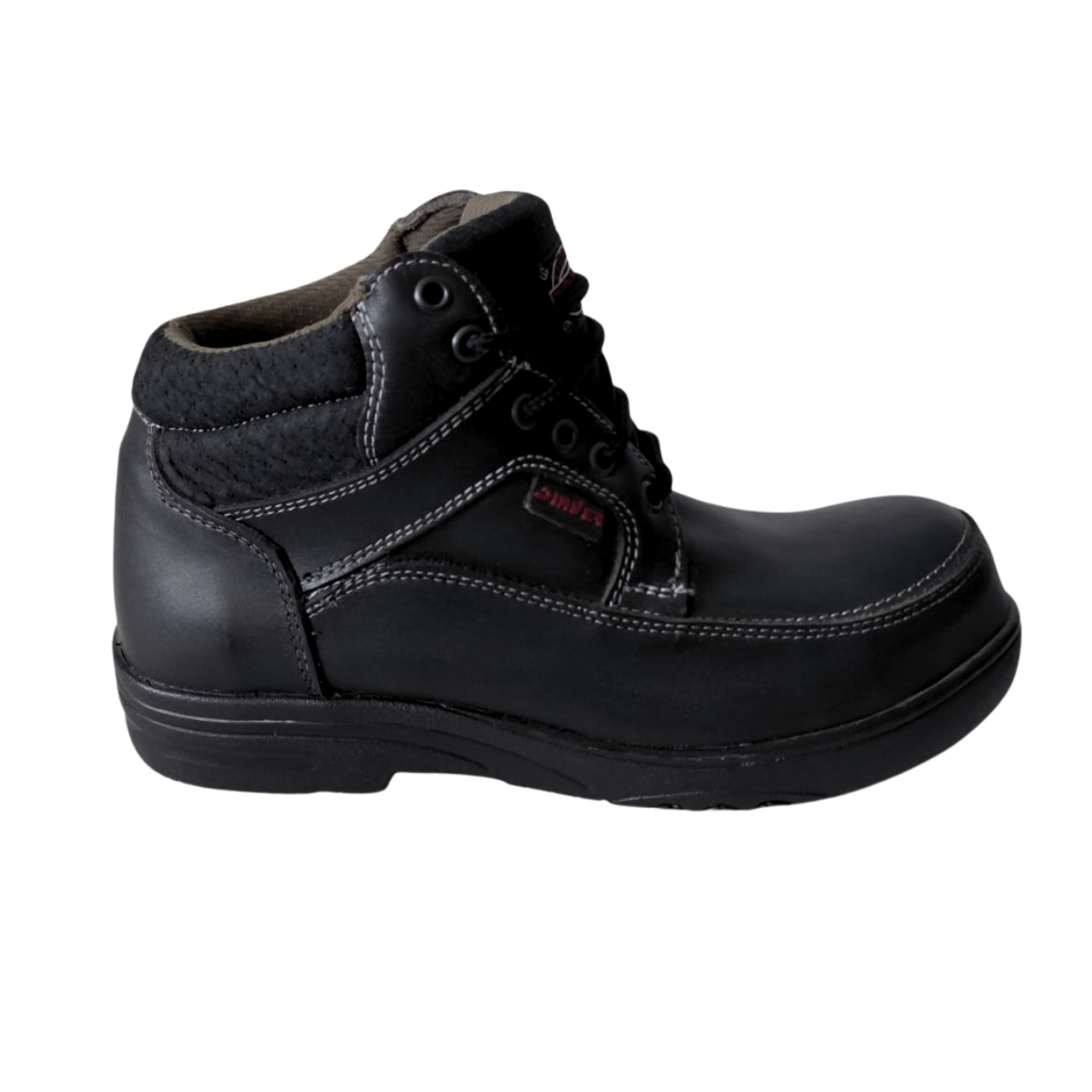 Descripción general: Calzado estilo borceguí (corte bajo) elaborado en piel negra con costuras blancas. Cuenta con forro de malla Baical, plantilla de poliuretano y suela de Poliuretano (PU). Es un Calzado Ocupacional (Tipo 1) con casco de TPU, diseñado para entornos con exposición a riesgos menores.