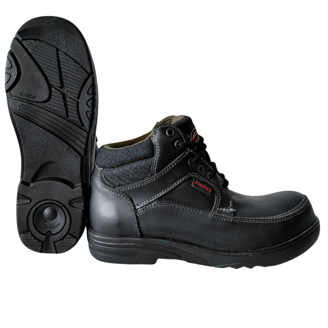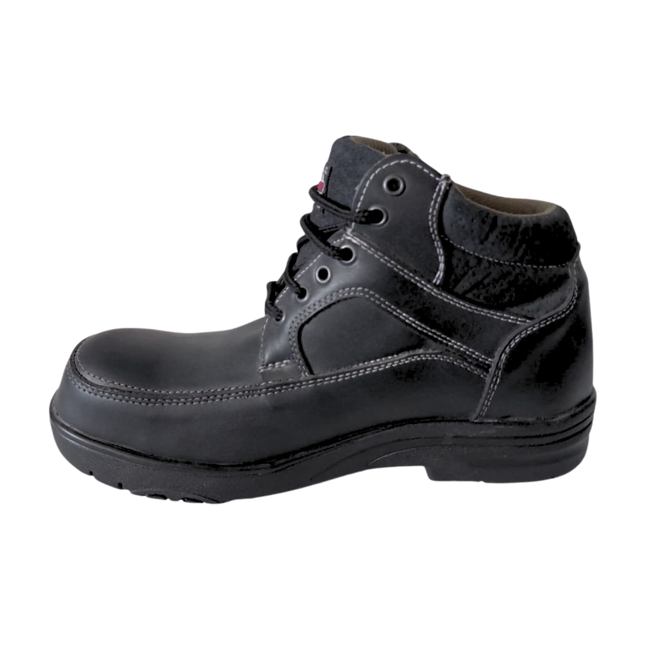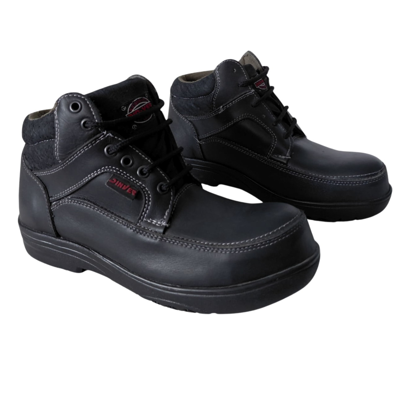 Descripción general: Calzado estilo borceguí (corte bajo) elaborado en piel negra con costuras blancas. Cuenta con forro de malla Baical, plantilla de poliuretano y suela de Poliuretano (PU). Es un Calzado Ocupacional (Tipo 1) con casco de TPU, diseñado para entornos con exposición a riesgos menores.